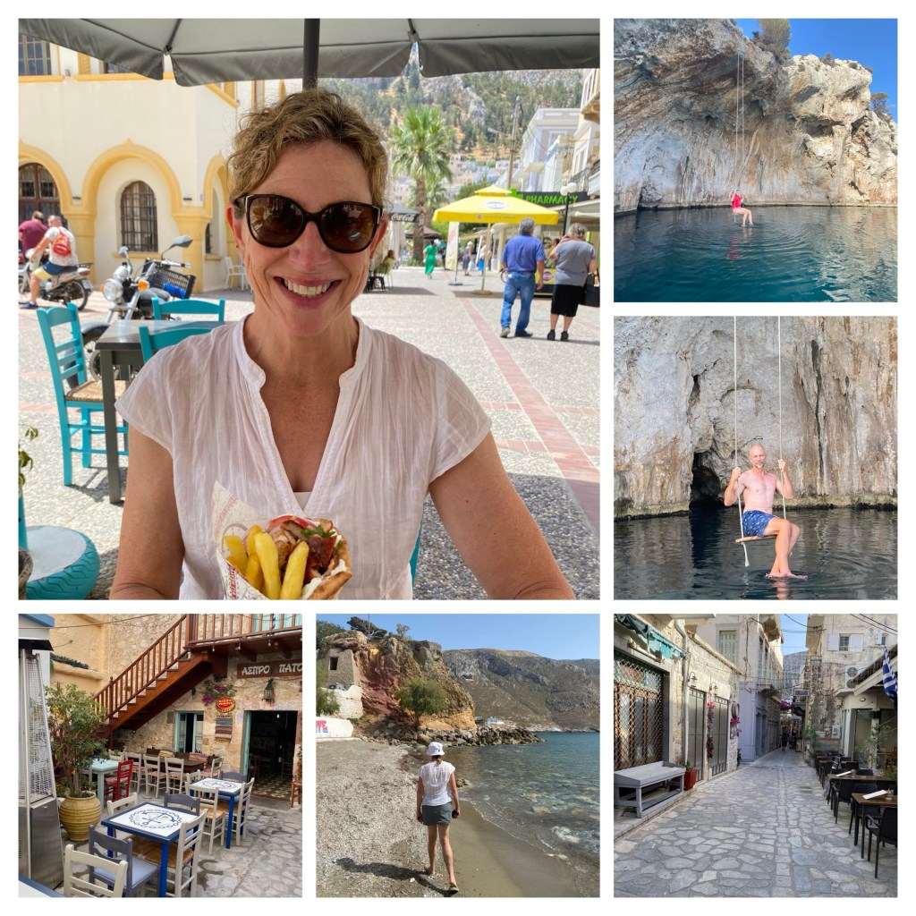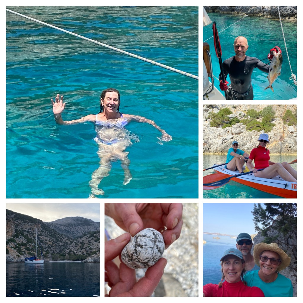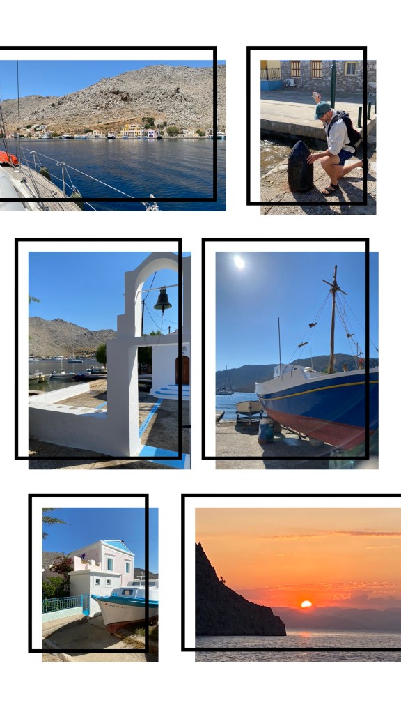 Our trip across the borders this time was uneventful, and we puttered into the anchorage outside the village of Pedi, on the island of Symi, in short order. Last year we stayed in the nearby town of Symi, and it was madness. Symi town is a hub for tourist ferries from within Greece and those coming from Türkiye. The town dock is conveniently close to the town centre, but the regular ferries create large wakes which bounce your boat about. This is not only irritating but can be dangerous if we aren’t securely moored some distance from the stone town wall. It’s like being home, doing your housework when suddenly you (and your home) are on a particularly gnarly roller coaster ride. The neighbouring boats are the other carriages but instead of them being in front and behind you they’re all tethered alongside, rubbing fenders and hulls for those unlucky enough to not have adequate fenders. It’s enough to make even a hardy sailor swear.