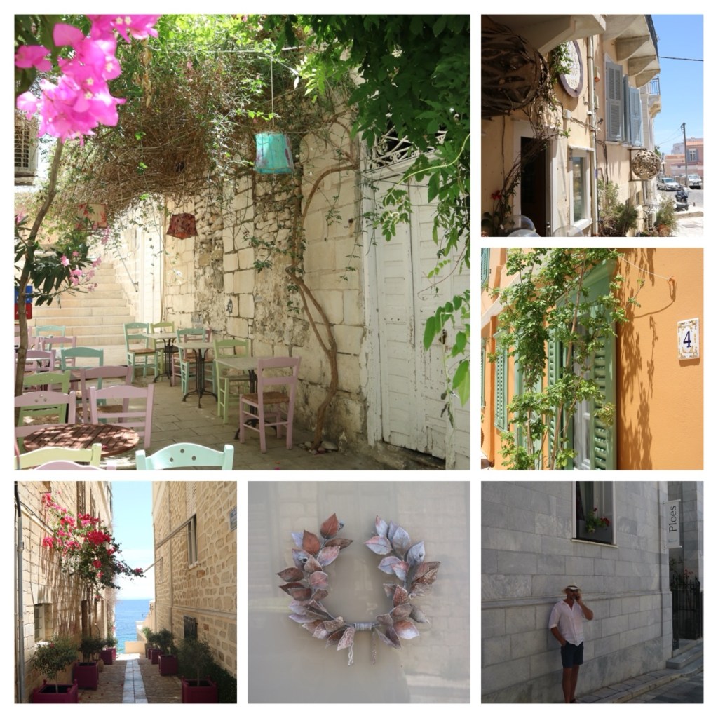 Symi town is crazy with the noisy hub bub of tourists. This is a sharp counterpoint to the sombre and weary faces of the refugees we saw being marched through the town on a previous visit. At the height of the season, when it’s hot and sticky, the hordes can be oppressive and there is little respite in the form of a breeze or shade unless you find a chair at one of the plentiful cafes.